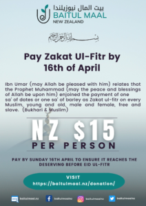 Paying NZ$15 Zakat ul-fitr per person to Baitul Maal New Zealand by 16 April 2023 will ensure it reaches the